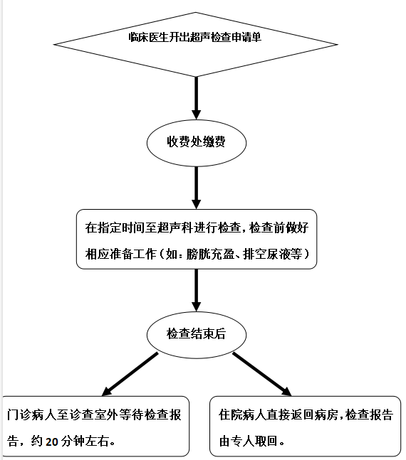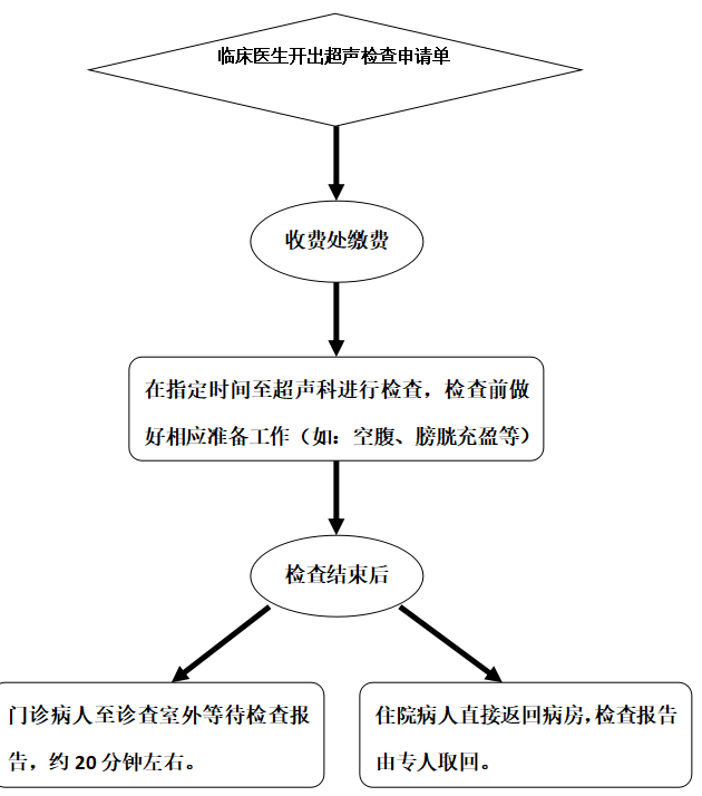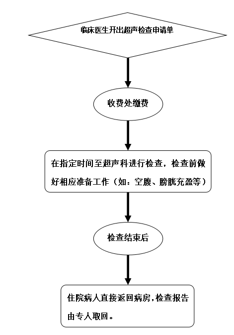 超 声 检 查 须 知 (住院部) 1. 为保证优质的超声诊断水平,请来本科进行超声检查的住院患者按序号前来检查。为保持良好的超声诊疗环境,请您在室外耐心等待,按序进入检查。 2. 胆囊、胰腺等消化系统脏器检查请于检查当日空腹(检查前一天晚餐清淡饮食后至次日检查前不要进食,一般要求空腹8小时以上)。 3. 膀胱、前列腺等泌尿系统脏器检查前请先饮水500~1000ml,等待1~2小时,待膀胱适度充盈后再行检查。 4. 妇科(经腹)检查前请先饮水500~1000ml,等待1~2小时,待膀胱充盈良好后再行检查。 5. 当日行胃肠镜检查、X线胃肠道造影检查后不适宜行消化系统超声检查。建议上述检查3天后再做超声检查。 6. 危重、抢救(外伤、休克等)患者可予优先检查。 7. 进入诊查室内请勿大声喧哗,保持室内安静的诊疗环境。检查结束后直接返回病房,检查报告由专人取回。 超 声 检 查 流 程 (住院部)