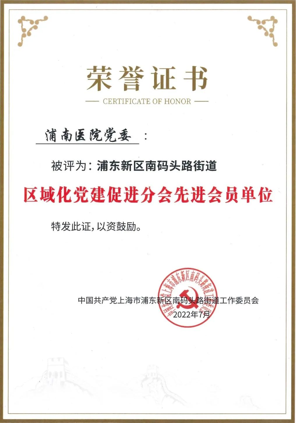 喜报 | 浦南医院党委荣获 南码头街道“区域化党建促进分会先进会员单位”